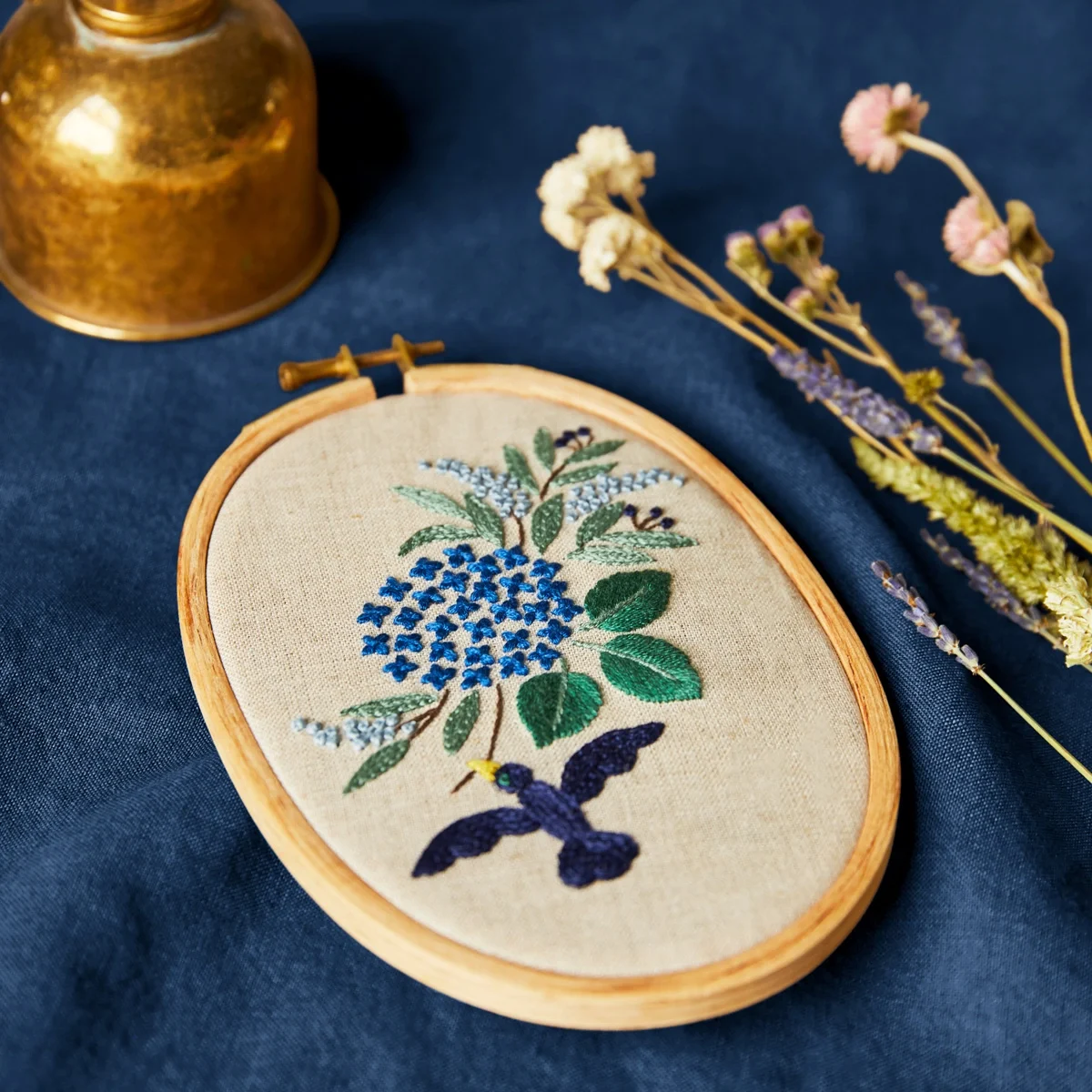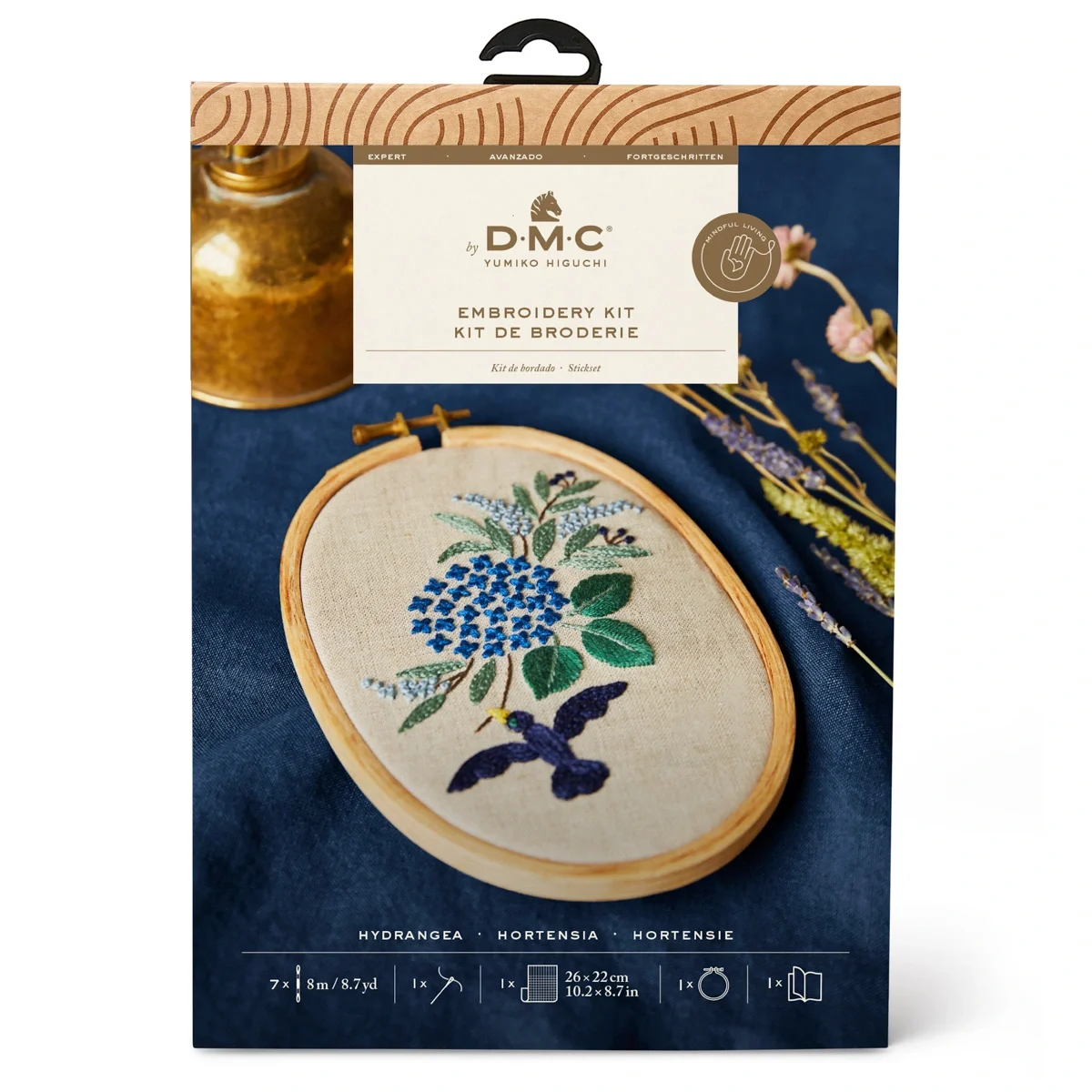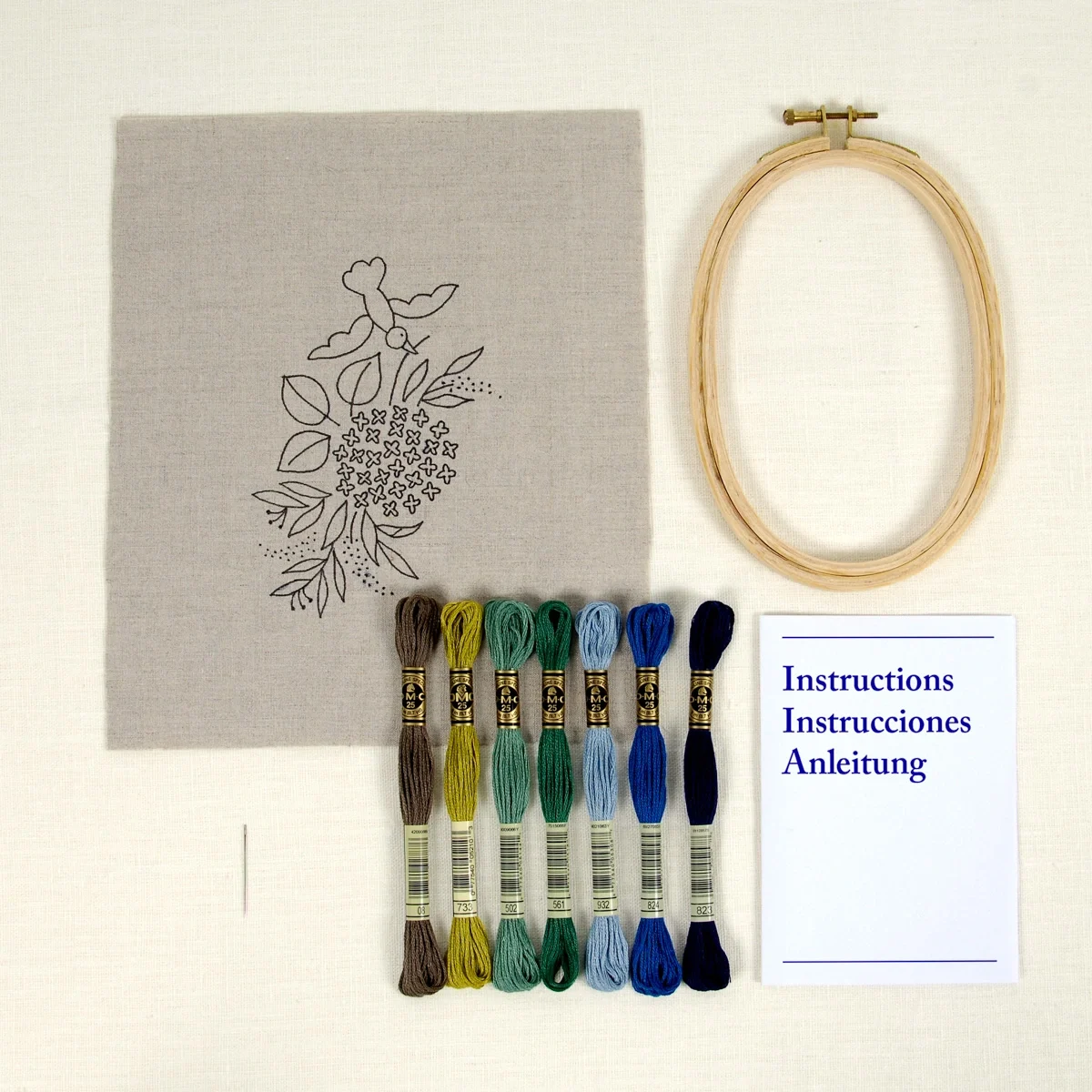 Complete embroidery kit, includes printed linen, hoop, needle, DMC skeins and instructions