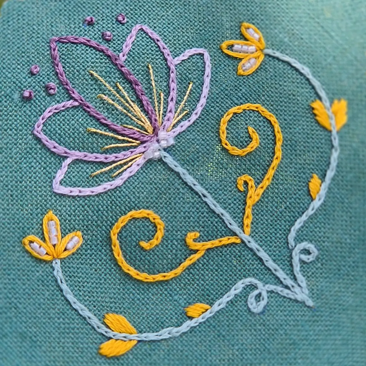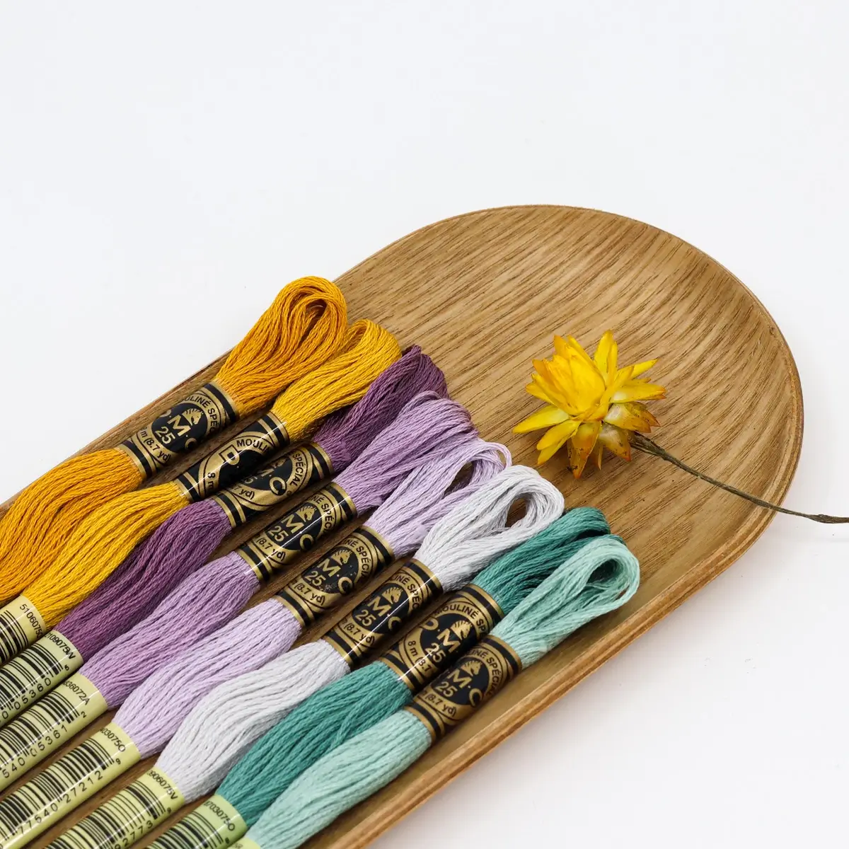 This selection combines vibrant yellows, delicate lilacs, pure white and fresh greens – perfect for floral embroidery, light and full of soft contrast.
