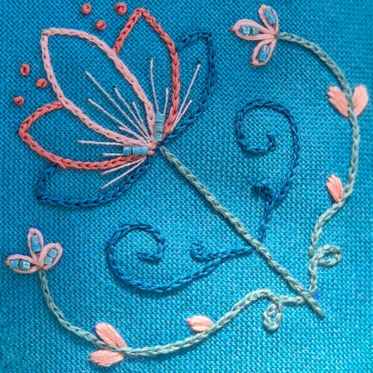This is a fresh and luminous palette that brings together soft creams, delicate peaches, aqua greens and a turquoise blue – ideal for serene, modern and light embroideries.