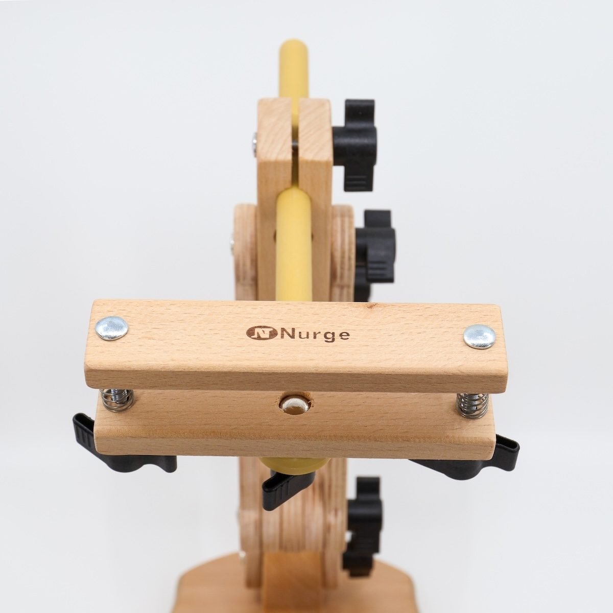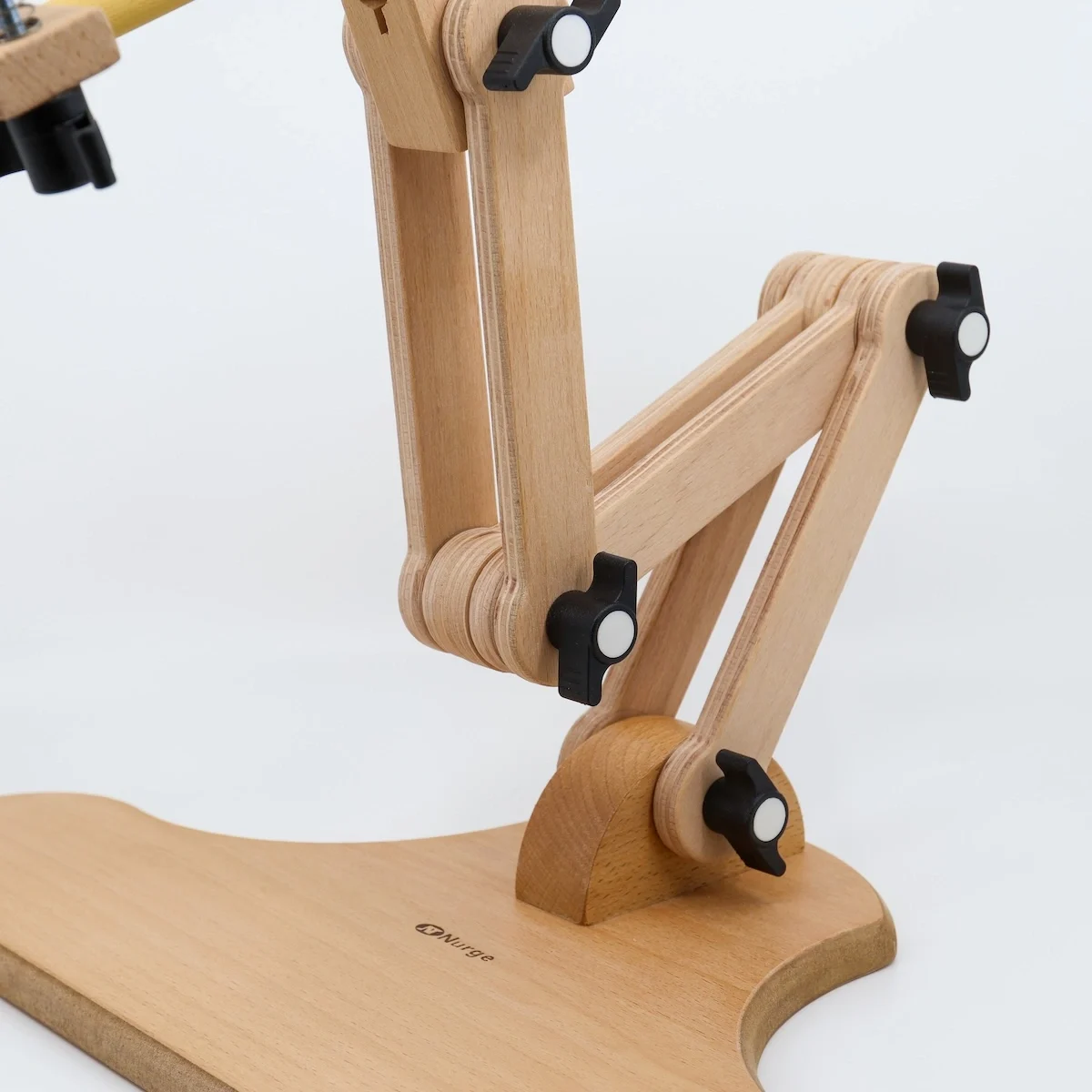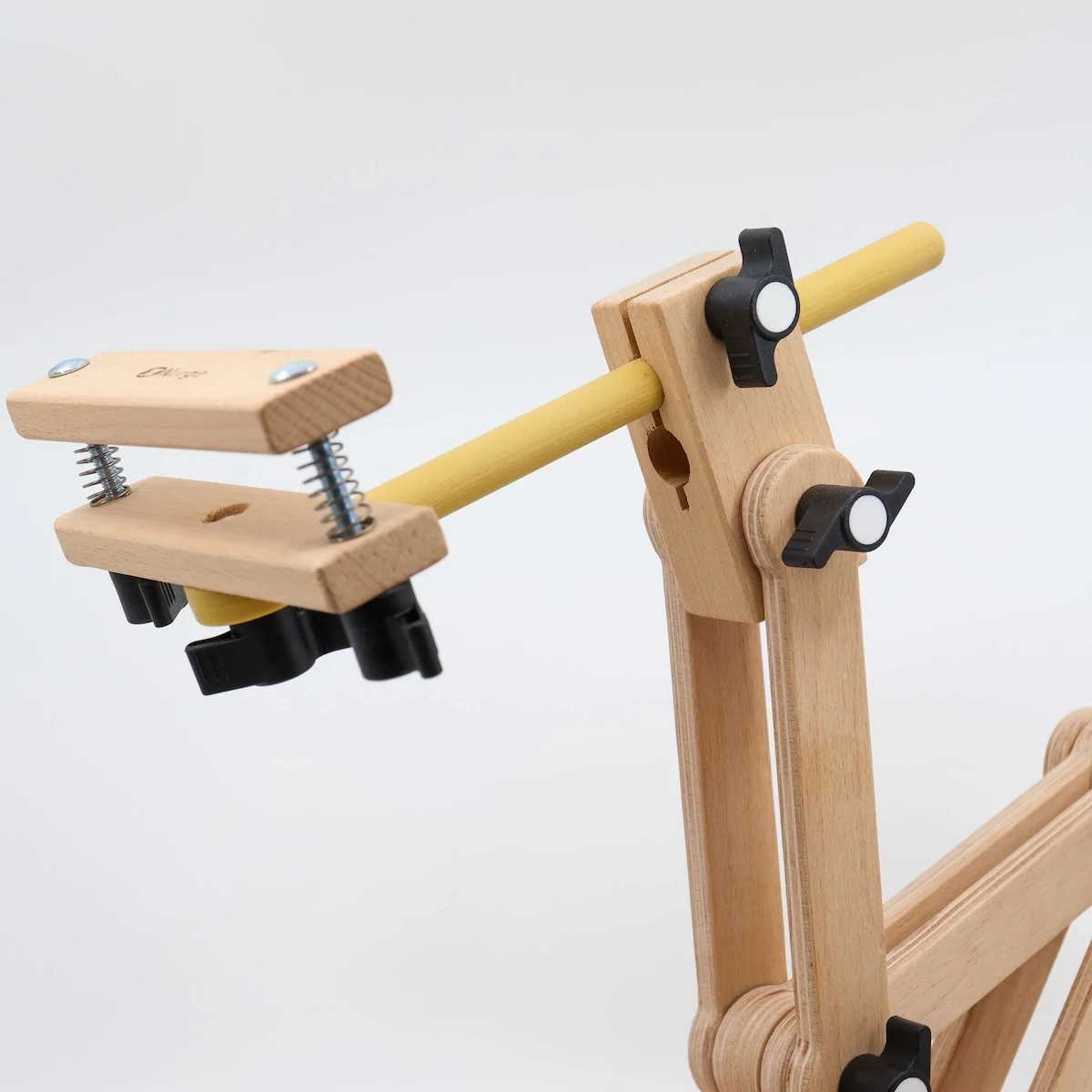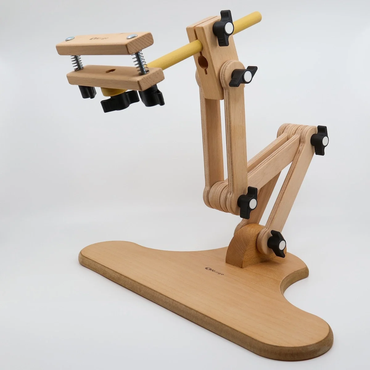 This lifesaver from Nurge is made of solid wood and has 5 points of articulation. The wide, solid base offers stability and allows you to embroider at the table or sitting on the sofa by hooking it under your legs. The special highlight goes to the clamp: it holds wider hoops firmly, oscillates and rotates 360° (giving you instant access to the back of your embroidery).