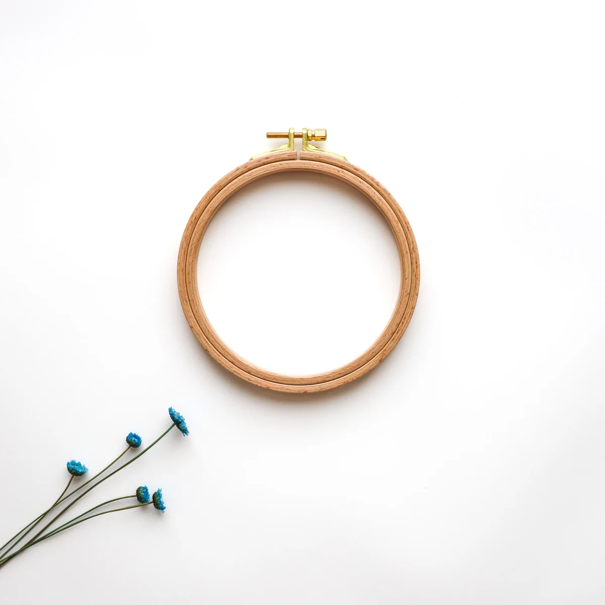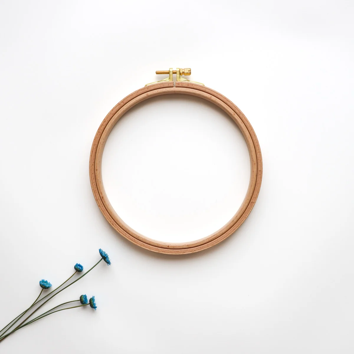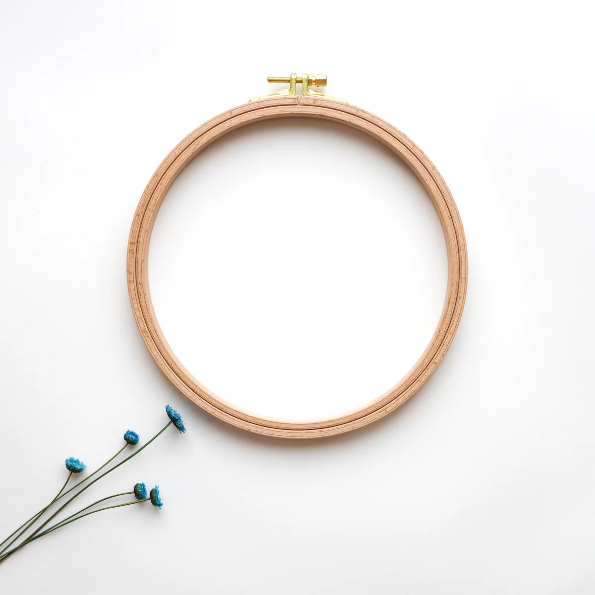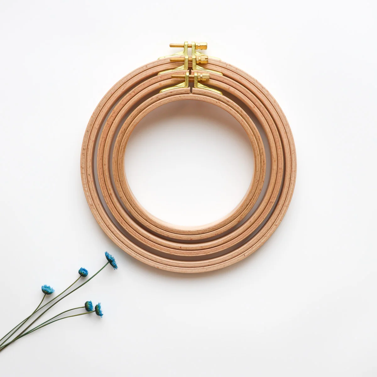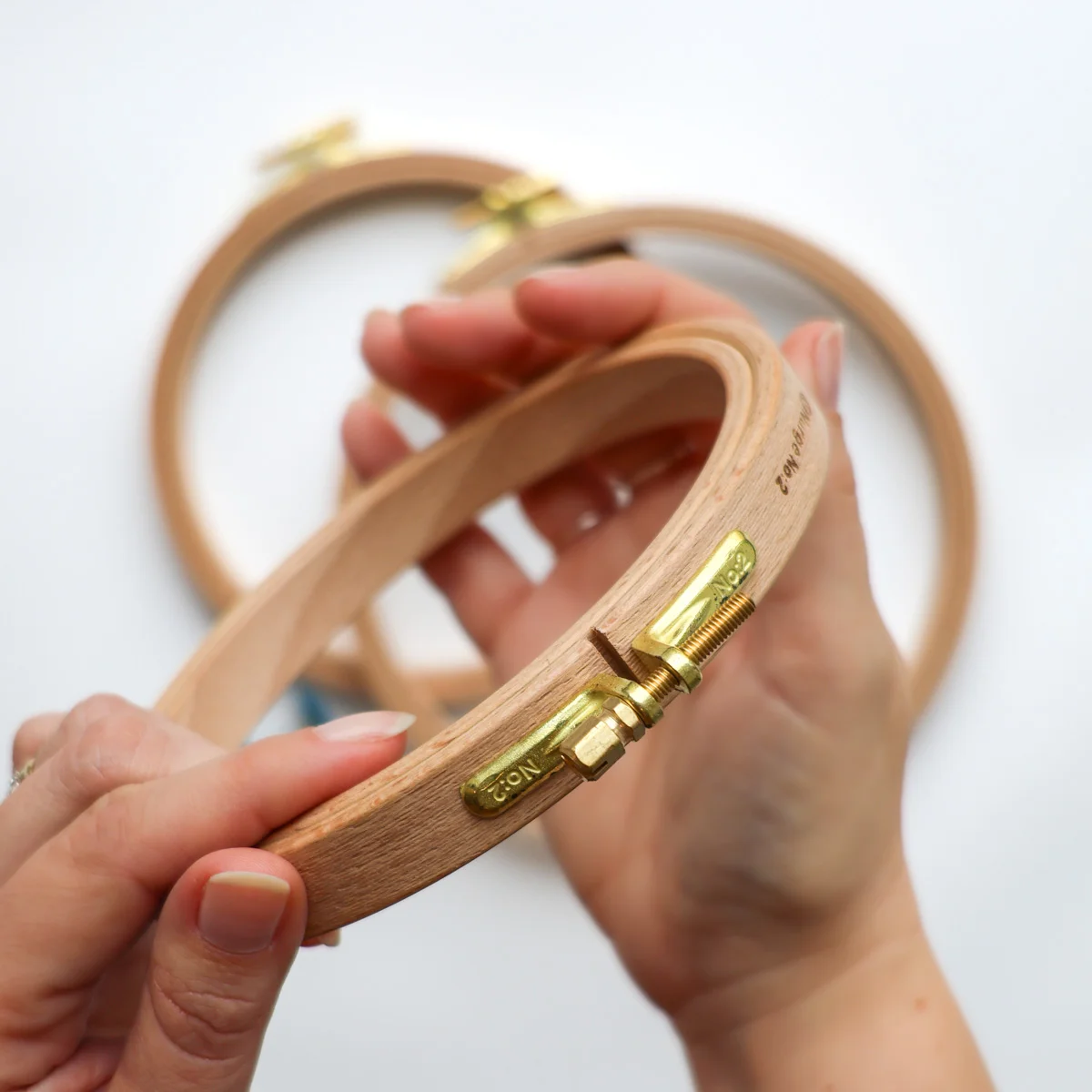 High-quality beechwood embroidery hoop, 16 mm thick, available in various sizes.
