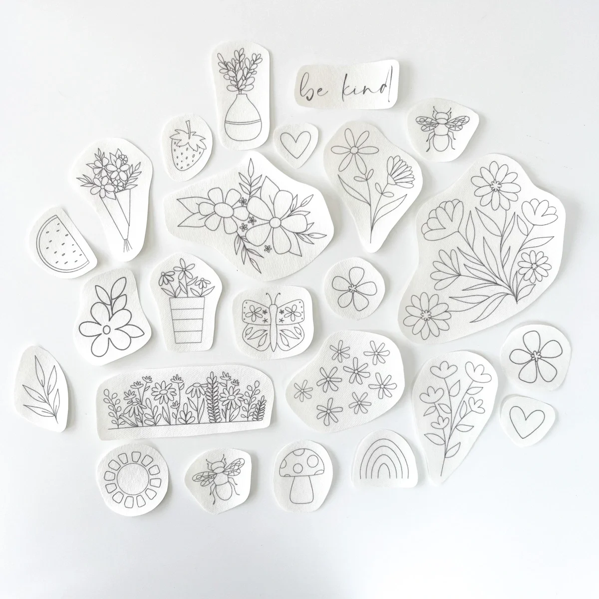 If you’re looking for a quick, ready-to-embroider solution – here you go. Choose your favourite set of designs, apply, embroider, rinse and – voilà! Perfect for embroidering on clothing or using on other smaller projects.