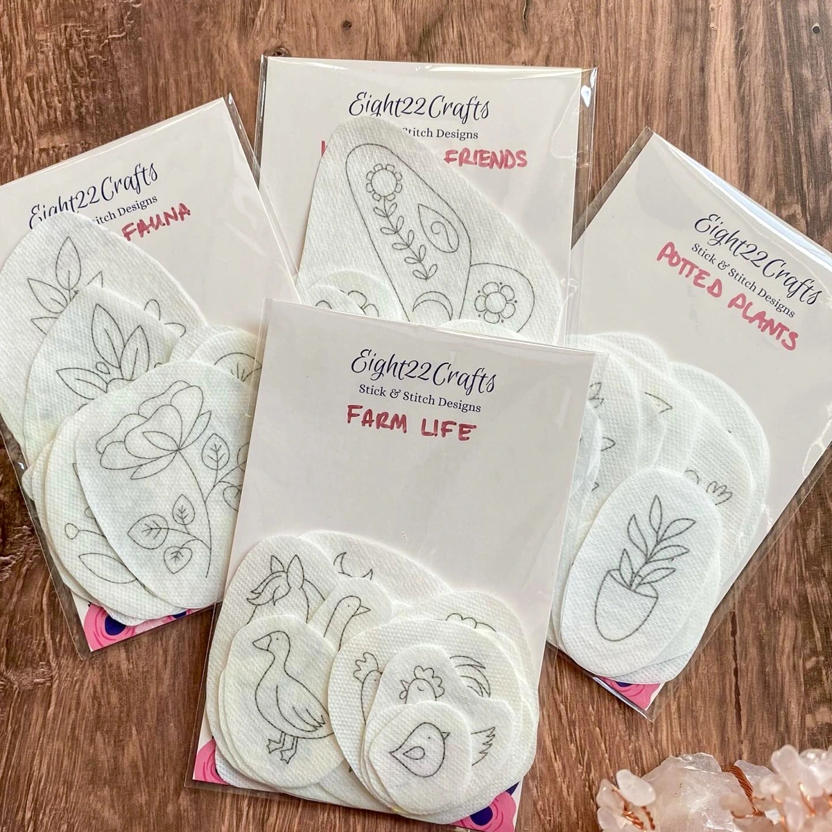 Water-soluble embroidery stickers, perfect for stitching on clothing and accessories. Multiple design sets available.