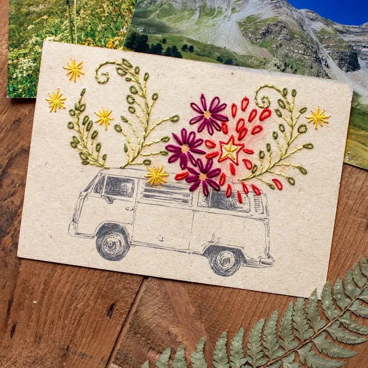 Kit DIY completo que inclui cartão postal, fios de bordar, agulha e instruções.