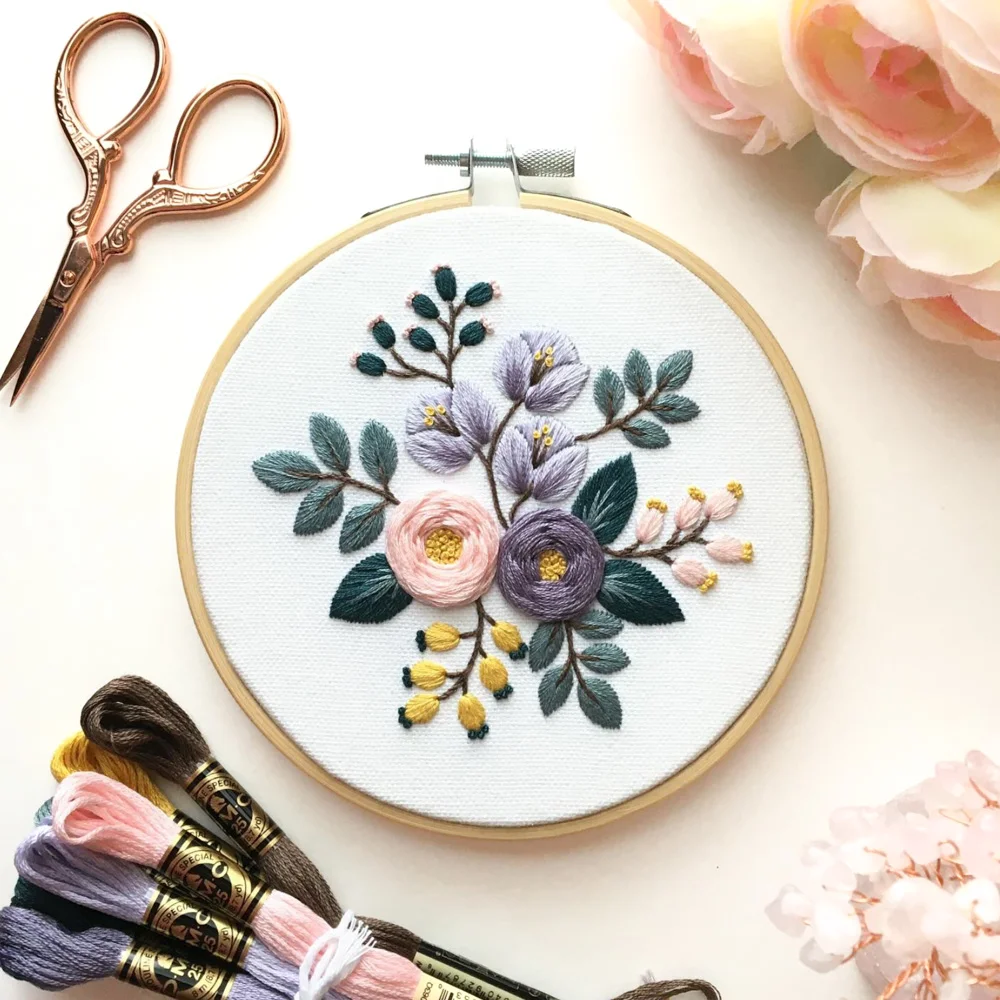 As suas paletas de cores harmoniosas e femininas são uma das suas imagens de marca, e este kit completo de bordado DIY é um excelente exemplo disso. Esta delicada composição floral em tons pastel conquista-nos imediatamente.