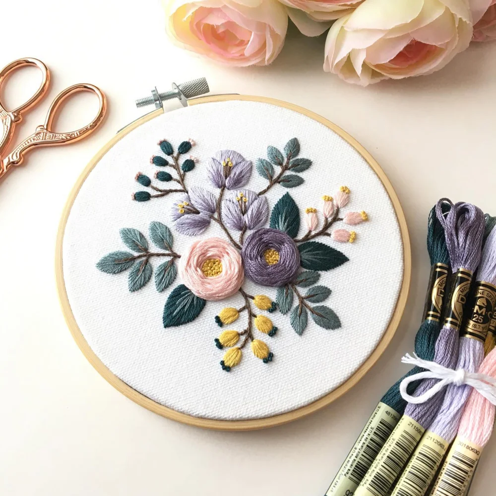 Kit completo de bordado floral em tons pastel. Inclui tecido, meadas e agulhas DMC, bastidor, feltro e instruções.