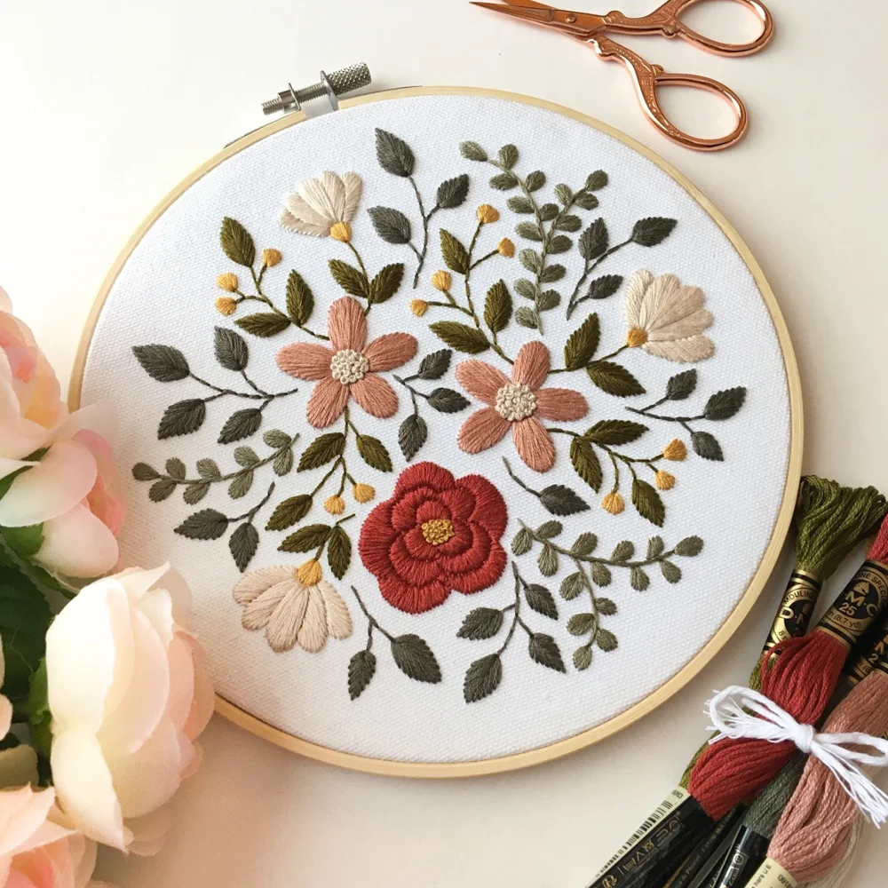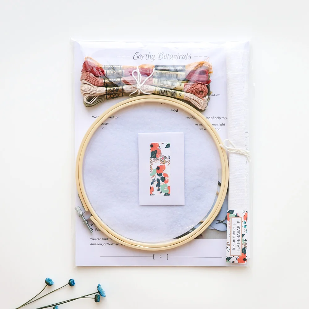 Kit completo de bordado floral em tons quentes. Inclui tecido, meadas e agulhas DMC, bastidor, feltro e instruções.