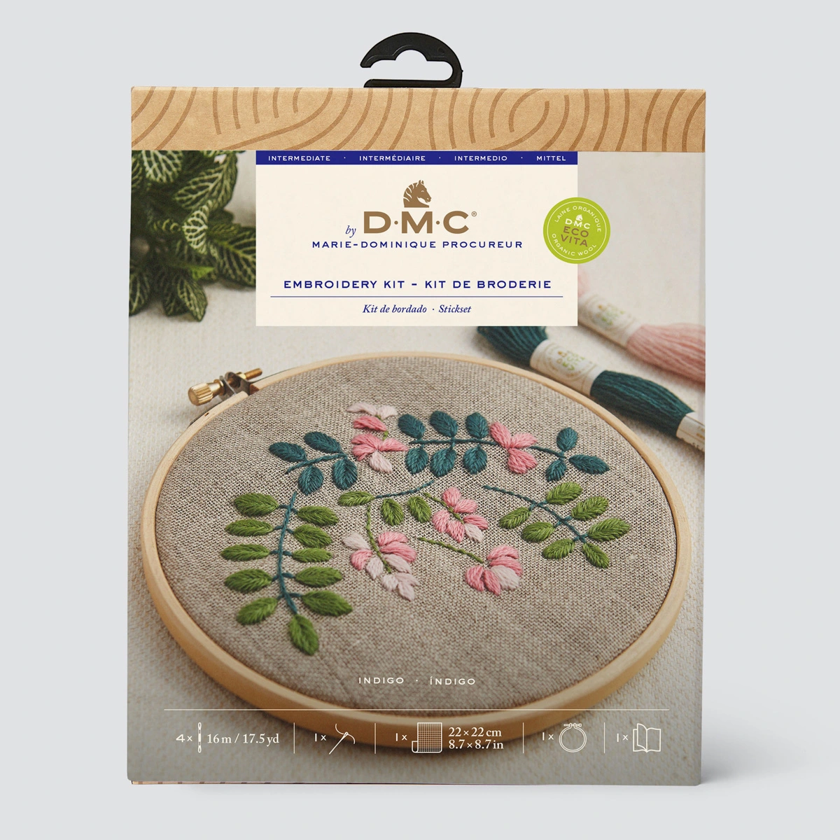 Kit DIY completo que inclui fios de lã DMC Eco Vita, bastidor, linho impresso, agulha e instruções.