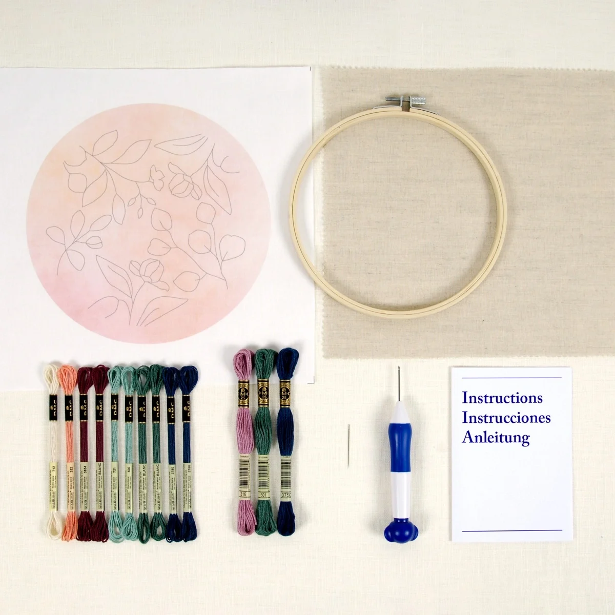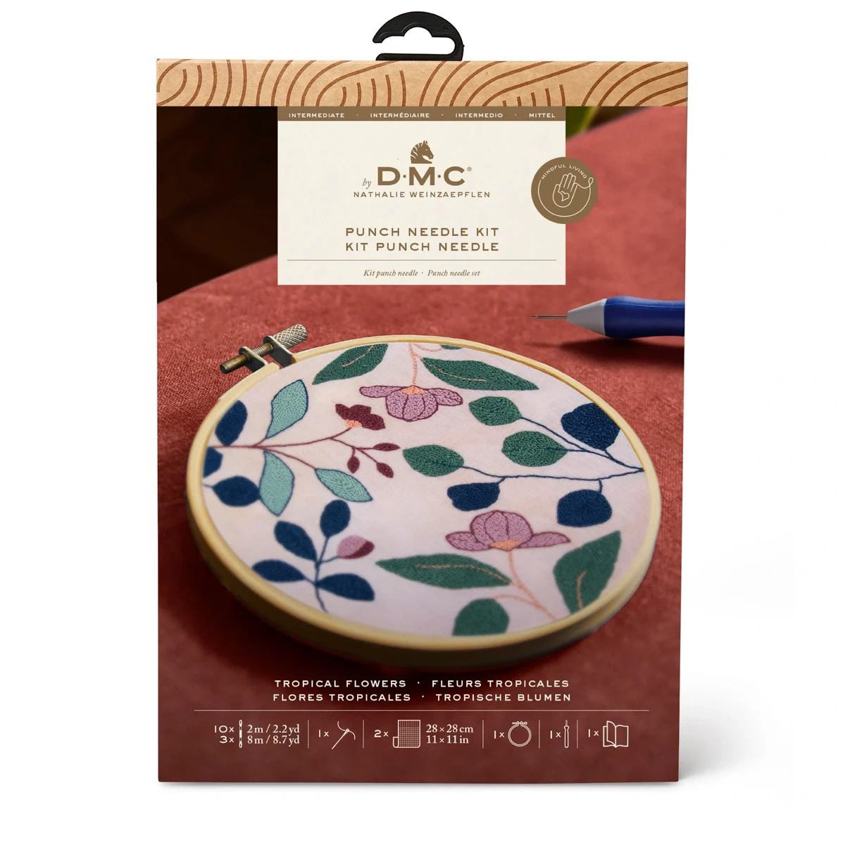 Uma composição contemporânea de folhas e botões em tons suaves de verdes naturais. Os desenhos de Nathalie Weinzaepflen, inspirados por viagens e paisagens subaquáticas, ganham vida neste kit. Inclui uma agulha punch needle fina, ideal para fios delicados, e tecido pré-impresso com o motivo, para começares a bordar de imediato.