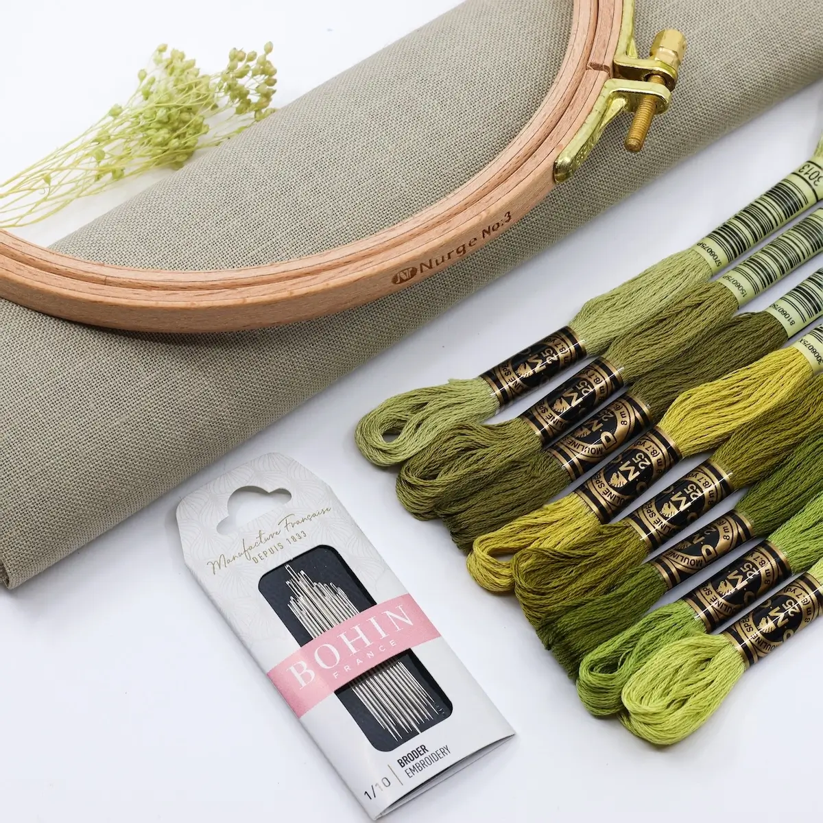 Um recorte de linho numa cor que entra em perfeita sintonia com o conjunto de 8 meadas DMC Mouliné Spécial;