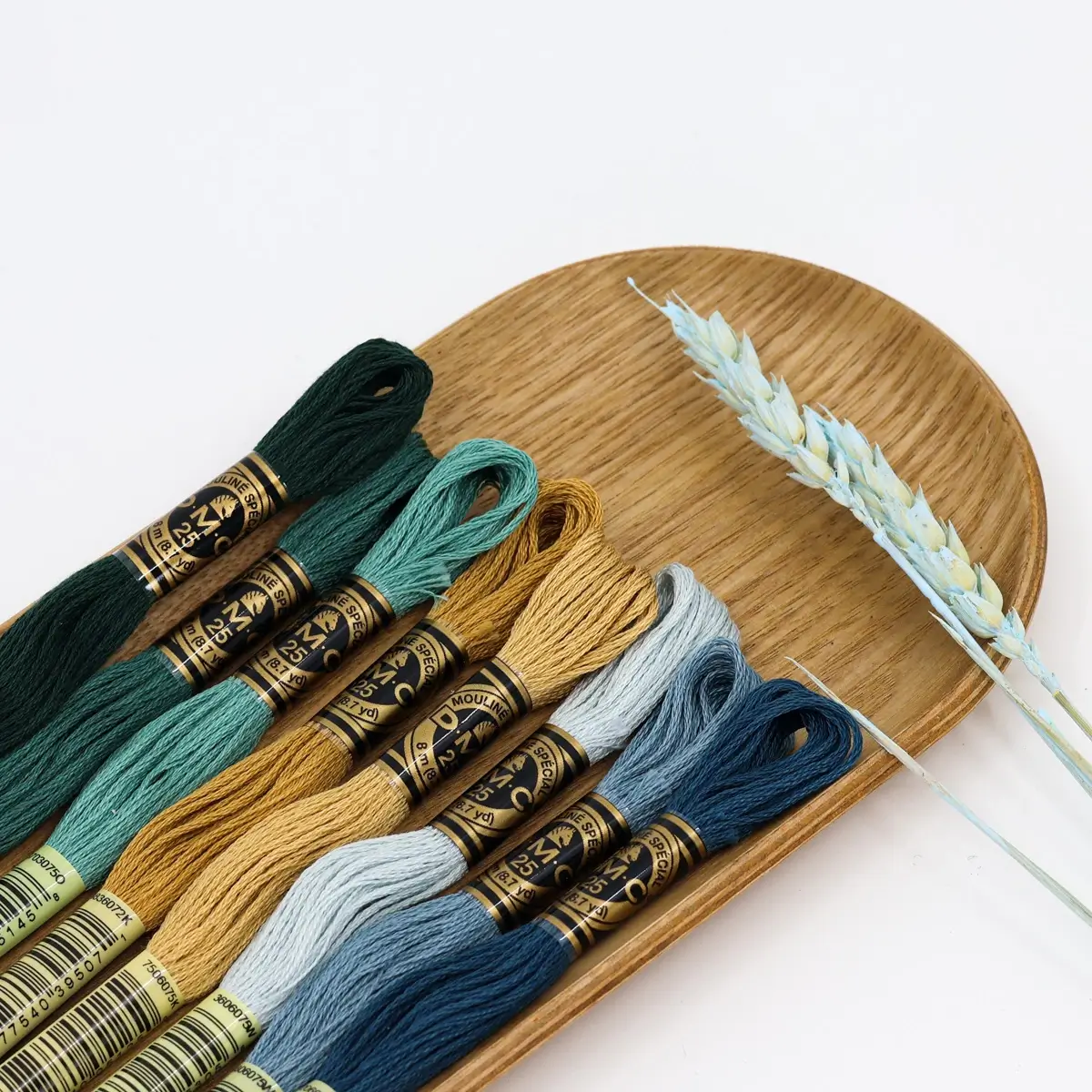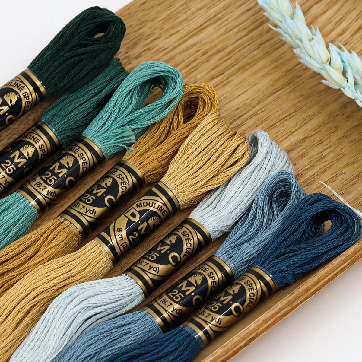 Uma paleta sofisticada que combina verdes intensos, dourados terrosos e azuis acinzentados — perfeita para bordados elegantes, naturais e cheios de profundidade.