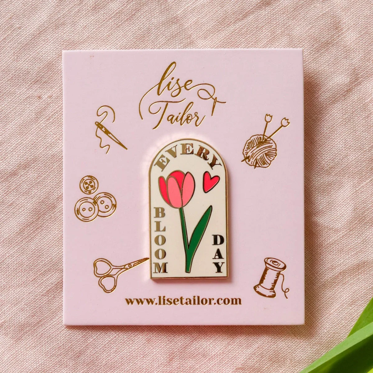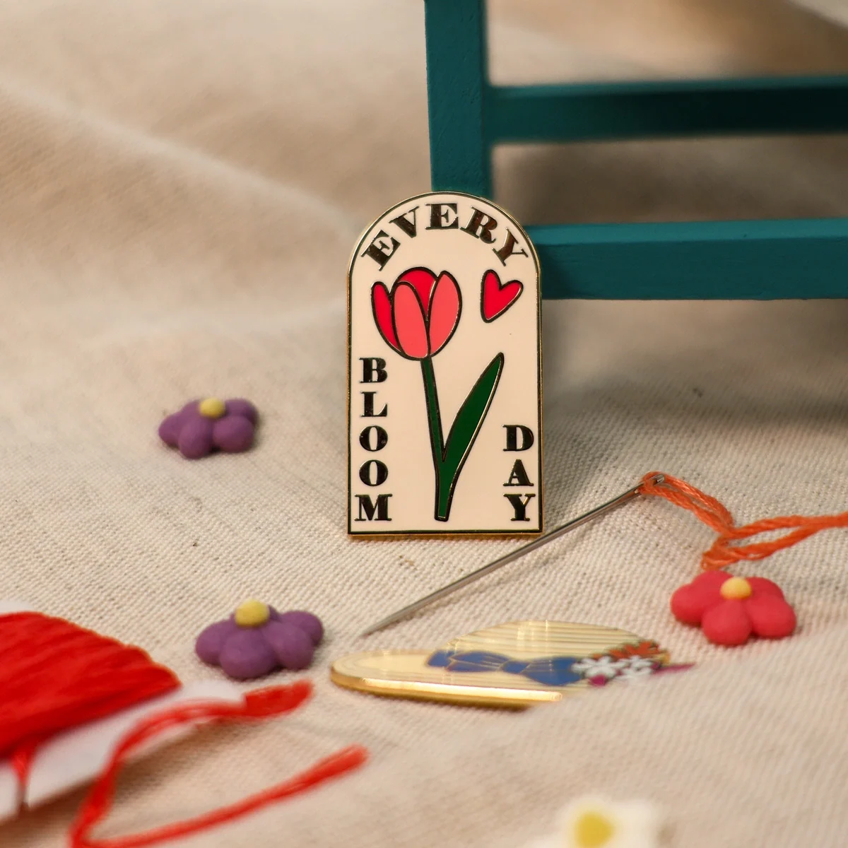 Este suporte magnético com desenho túlipa prende-se ao tecido através de ímans e mantém as agulhas juntas, evitando que bordadeiras distraídas como eu as percam.