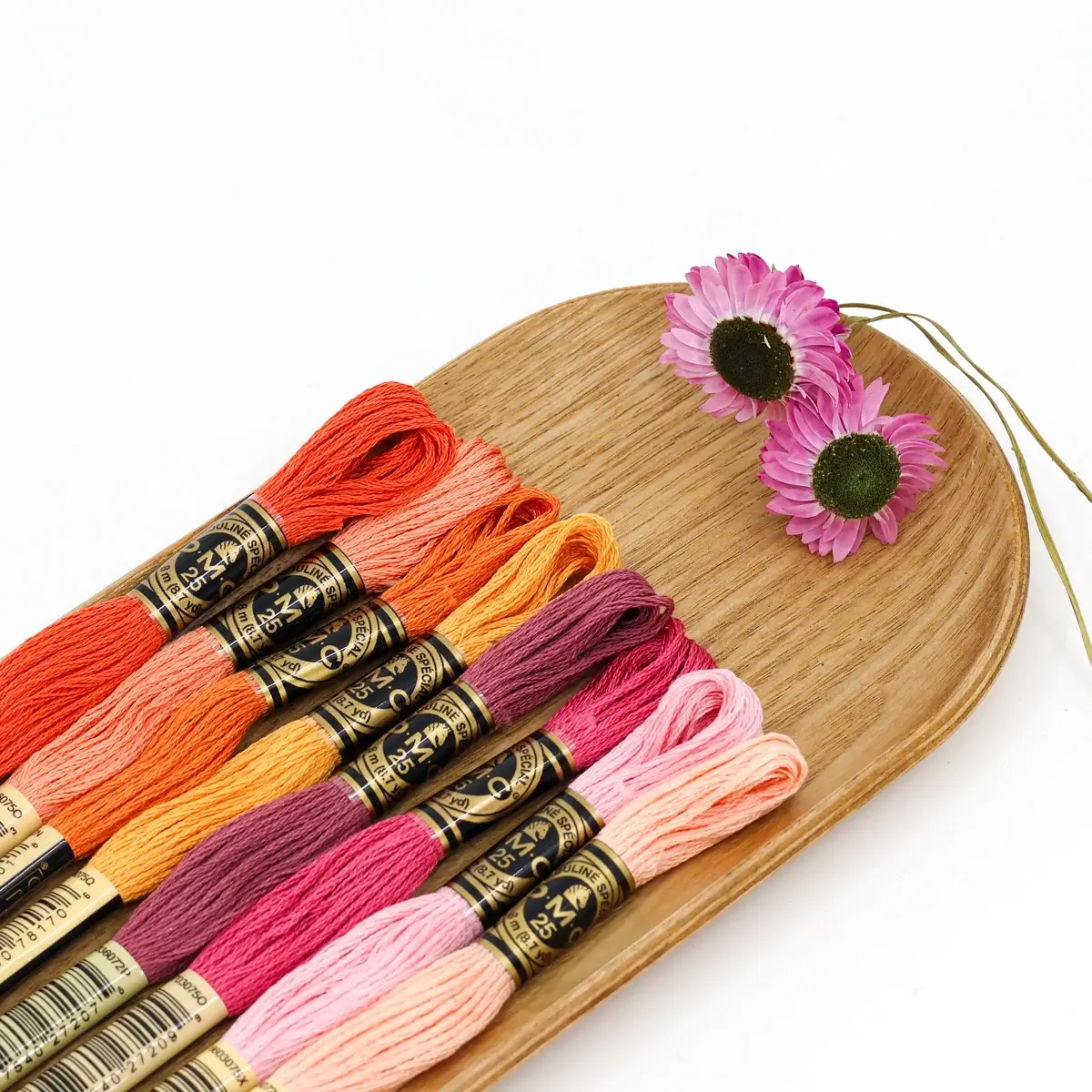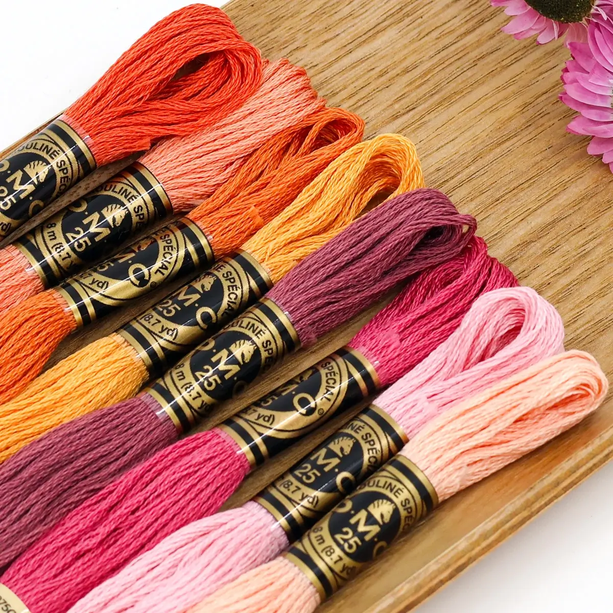 Esta seleção reúne laranjas luminosos, corais vibrantes e rosas quentes, equilibrados por um malva profundo — uma paleta energética e alegre, perfeita para quem quer criar bordados cheios de vida e contraste.